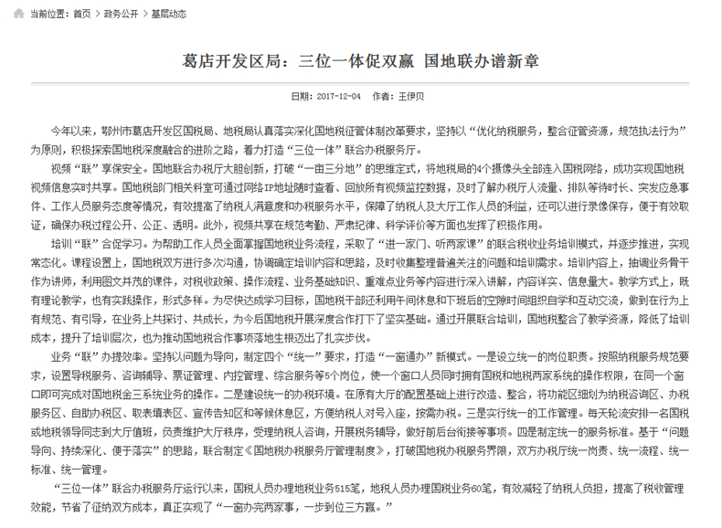 【省局基层动态】葛店开发区局:三位一体促双赢 国地联办谱新章